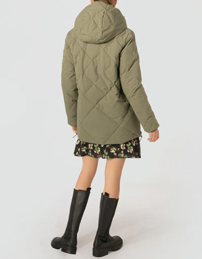 Diese modische Daunenjacke ist der ideale Begleiter für die kühlere Jahreszeit und garantiert bei unbeständigen Wetterkonditionen einen wasserabweisenden, sowie wärmeisolierenden Schutz. Das Design präsentiert sich mit einem hohen Kragen mit angeschnittener Kapuze, bequemen Rippenstrickbündchen am Ärmel und komfortablen Seitenschlitze für Mehrweite.